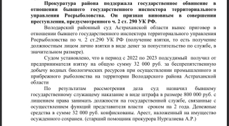 Прокуратура района поддержала государственное обвинение в отношении бывшего государственного инспектора территориального управления Росрыболовства. Он призная виновным в совершении преступления, предусмотренного ч. 2 ст. 290 УК РФ.